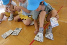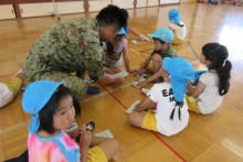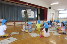安城市から3名の自衛隊の方にきていただきました。防災についてのクイズや、自衛隊の服装に変身して写真を撮ったり、新聞紙でスリッパをつくる…など盛りだくさんの体験をしました!