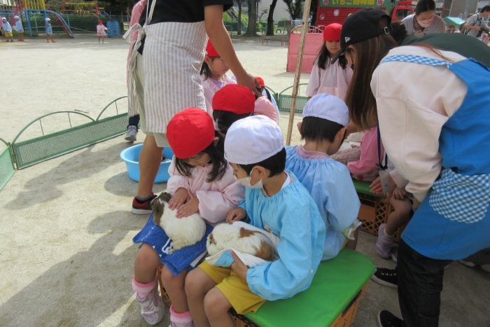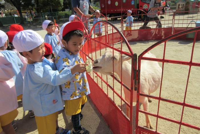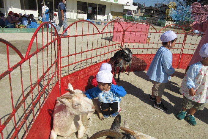 園庭が動物園に変身すると、各学年ごとに順番でロバ、ヤギ、モルモットやカメとの触れ合いやエサやりをしたり、うさぎのいちごちゃんとのお喋りや、ワンちゃんとの競走を楽しみました。