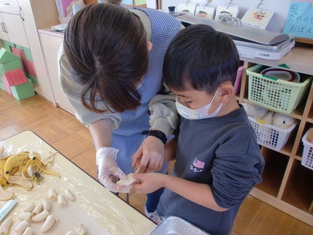 チョコバナナを作ると聞くと「お祭りで食べたことあるよ!」「僕チョコバナナ大好き!楽しみ~~🎶」とワクワクでした☆