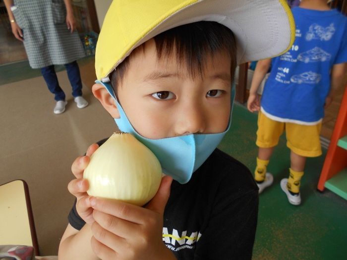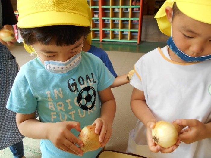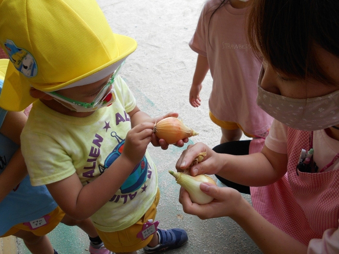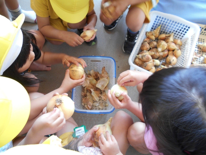先日収穫した玉ねぎの皮を剥きました!お家でお手伝いをしているのか、どの子も上手に皮を剥く事ができました♪