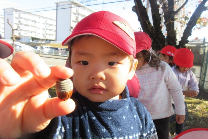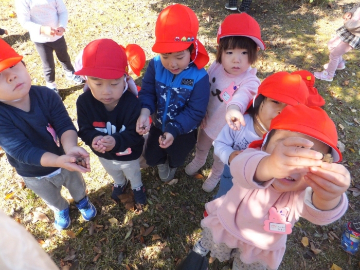 「大きいの見つけたよー!!」「いっぱい拾った💕」といっぱい落ちているどんぐりに夢中の子どもたち★