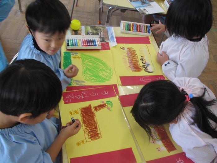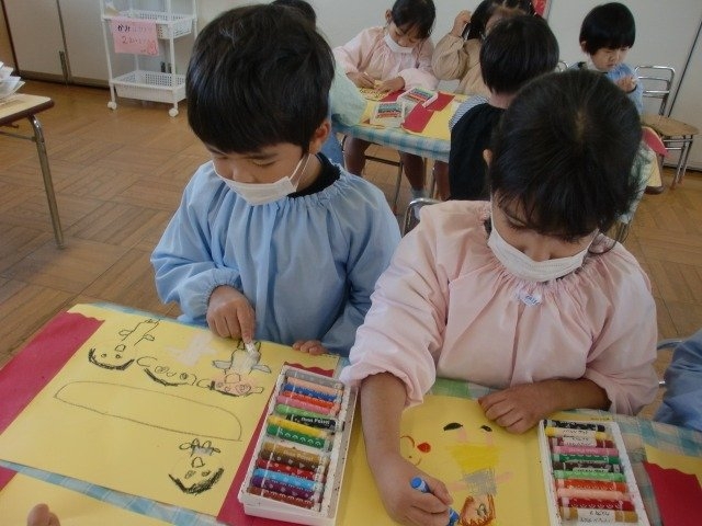 赤幕が貼れたら次はクレヨンで絵を描きます!
