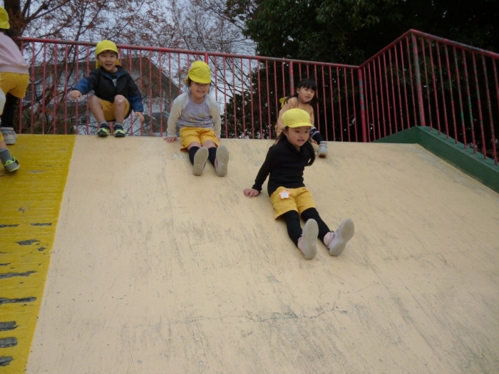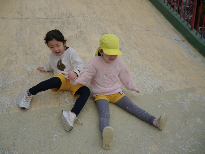 大きい滑り台に怖がる子もいましたが、お友達と手をつないで楽しそうに滑っています😍