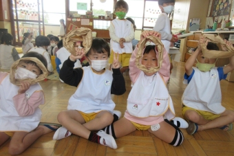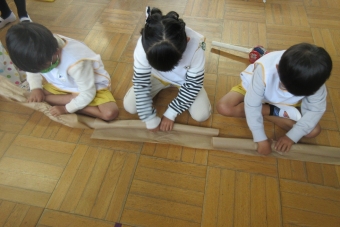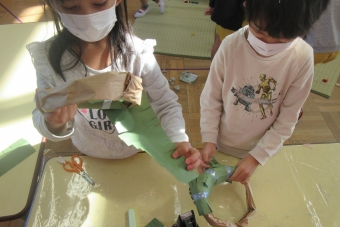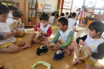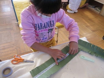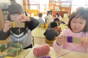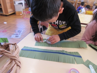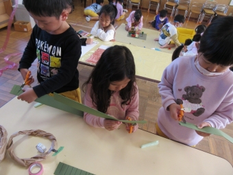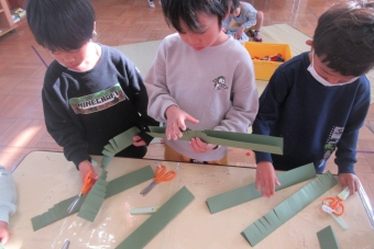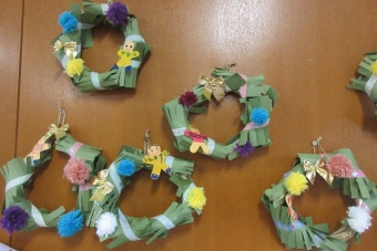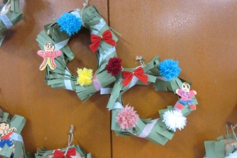 クリスマス製作でリースを作りました!まずは、土台は茶紙を巻いて作ります。部屋遊びで広告を使って遊んでいることもあり、くるくる巻くのはとっても上手😉土台ができたら、次は画用紙を切って茶紙に巻いていきます。画用紙に切り込みを入れて、本物の葉っぱの様な広がりを作りました🌿画用紙の端から端まで細かく切り込みを入れるので、「大変~!」、「このくらい切ればいいかな?」と集中して切る様子が見られました😄そして、切り込みを入れた画用紙の真ん中にマスキングテープを貼って、土台に巻き付けると何とリボンのようになるんです!次は、毛糸を巻いて飾りのポンポンを作りました。好きな色を3色選び、40回巻いていきます。「1、2、3、4、5・・・・・・」と数えながら巻いていき・・・「・・・・?あれ、今何回だっけ?」とかわいらしい姿も😁💚最後に、作ったポンポンやクッキーの名札、リボンを飾り付けたら完成!クリスマス会の日に持ち帰りますので、ぜひお家で飾ってくださいね🌟