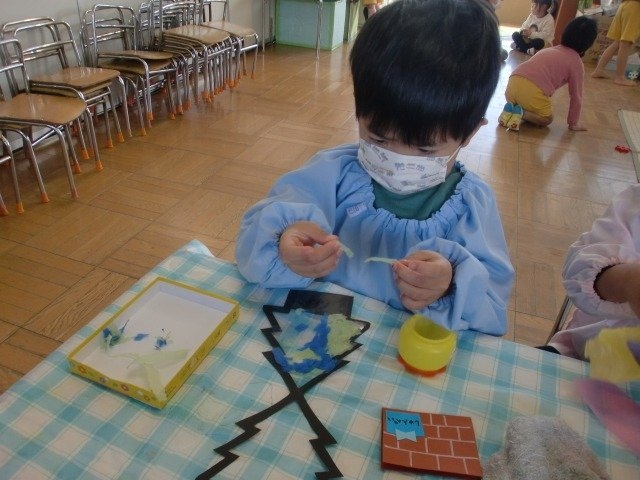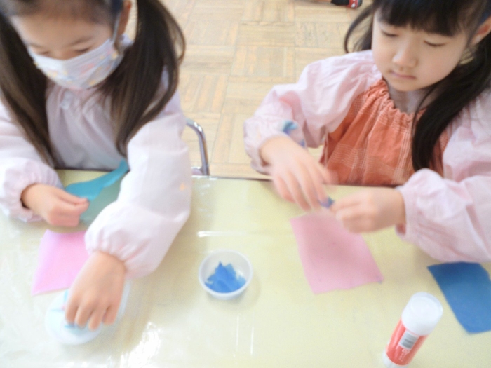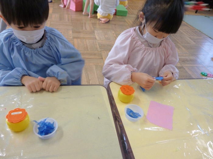 まずは好きな色のおはな紙を選んでおはな紙をちぎるよ😘