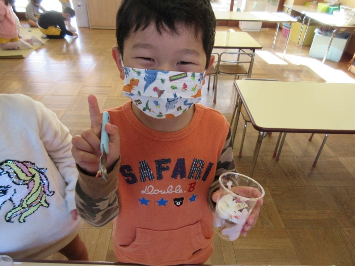先生がパフェをつくるよ!とお話をすると、「やったー!」「アポロ食べたことある!大好き!!」とわくわくが止まらない様子で、作りながら思わず「もう食べたーい😋」と心の声が漏れてしまう子もちらほら・・・いましたが😂