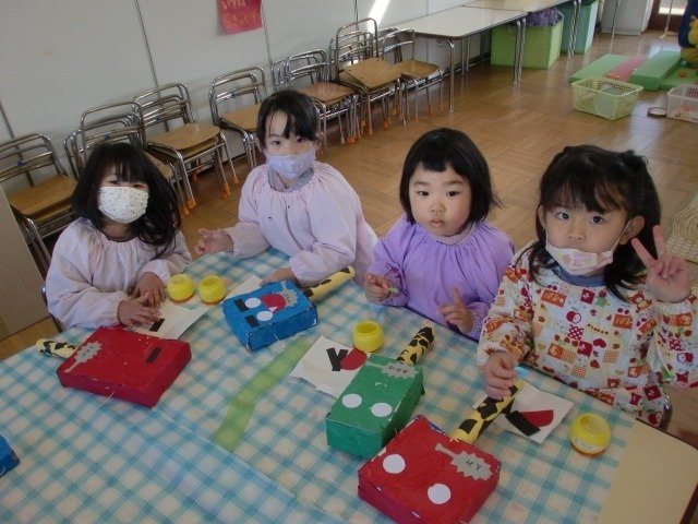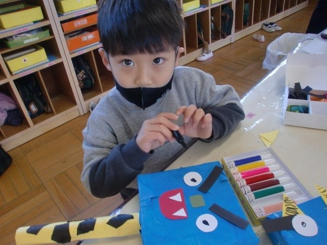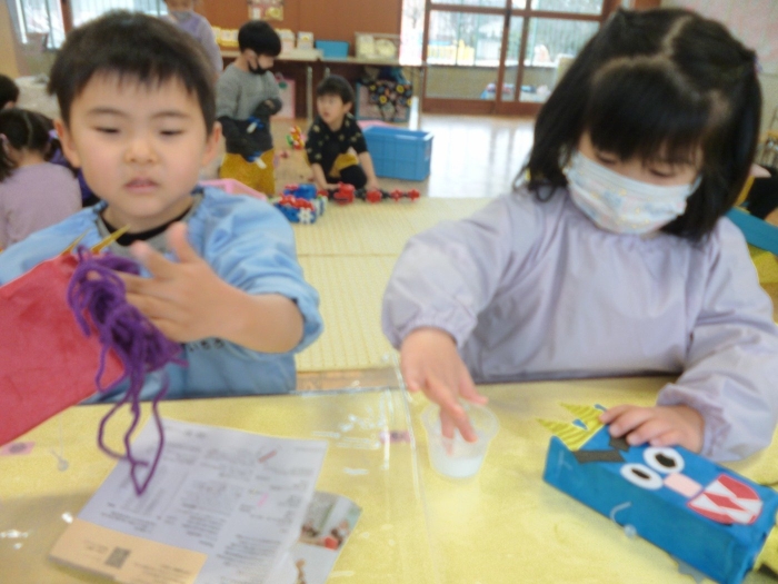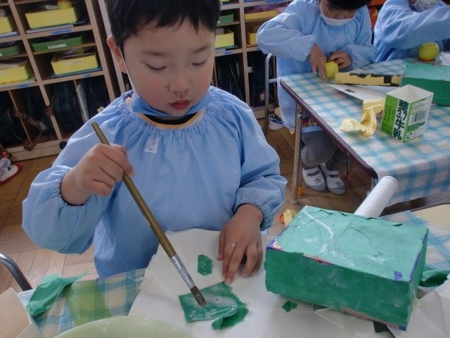 画用紙と箱がなかなかひっつかない!と苦戦する子もいる中、集中してつけていました。