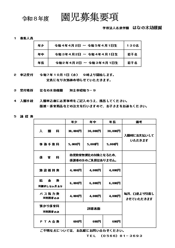 2025年09月05日(金) 10月1日(月)より入園願書の受付が始まります。 10月1日(月)より令和8年度園児募集がはじまります。 詳しくは園児募集要項をご覧ください。 なお園見学も随時お受けいたします。 ご希望の方はお気軽にご連絡ください。